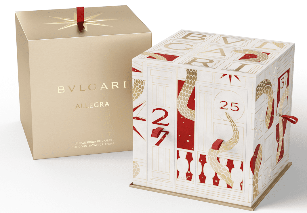 Pensé comme une parenthèse enchantée qui relie Noël au Nouvel An, ce calendrier exclusif réinvente le rituel de fin d’année. Contrairement aux calendriers de l’Avent traditionnels, le compte à rebours Bvlgari Allegra débute le 25 décembre pour étirer la féérie jusqu’au premier jour de 2026 ! 7 surprises olfactives et parfumées dévoilent l’univers raffiné d’Allegra : essences Magnifying, eaux de parfum iconiques ( Bvlgari Allegra Baciami, Bvlgari Allegra Fiori d’amore, Bvlgari Allegra Insieme), crème pour les mains et céramiques à parfumer. Une super jolie idée.. ce Calendrier de l’Après.. by Bvlgari. 410 €. Disponible sur bulgari.com