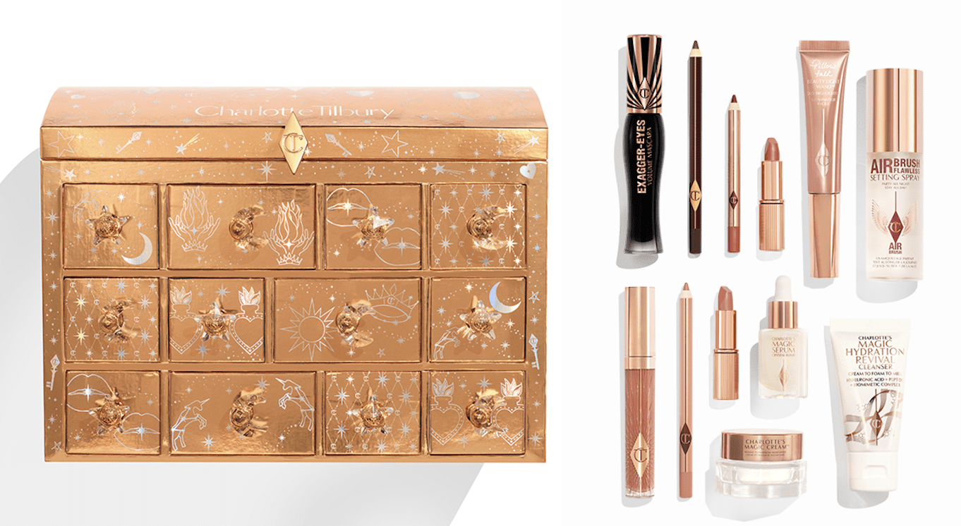 Dans ses 12 tiroirs bijou, le calendrier de l’Avent de Charlotte Tilbury cache les trésors les plus prisés de la marque : 7 produits de soin et 5 produits make-up grand format, choisis pour révéler “la star qui est en vous”.