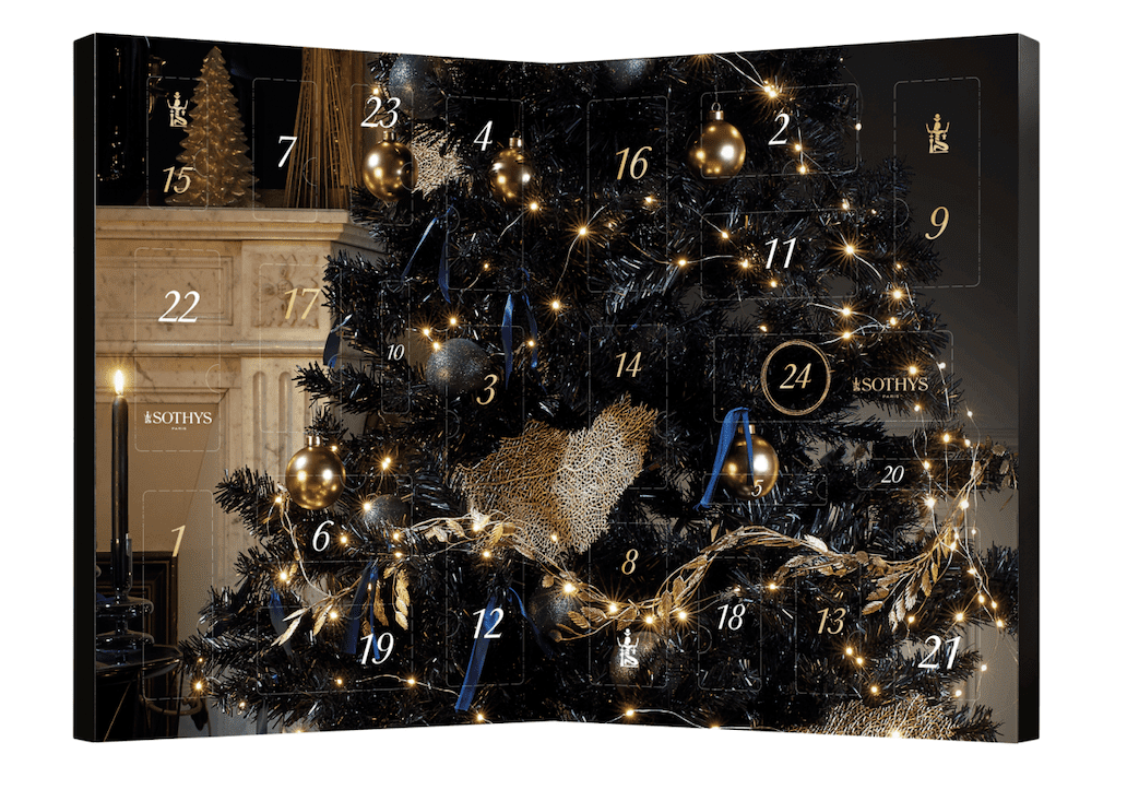 Bleu nuit et or scintillant habillent ce calendrier précieux : 24 instants de beauté pour un mois placé sous le signe du luxe et de la féminité. 24 surprises pour sublimer chaque matin de décembre : soins jeunesse, spécifiques, ampoules beauté, et 2 formats vente (Roll-on Cryo anti-poches et Correcteur make-up énergisant). Depuis 1946, Sothys rayonne dans plus de 120 pays, et ce calendrier en est l’expression parfaite. 99 € (valeur 319,75 €). Disponible sur sothys.fr
