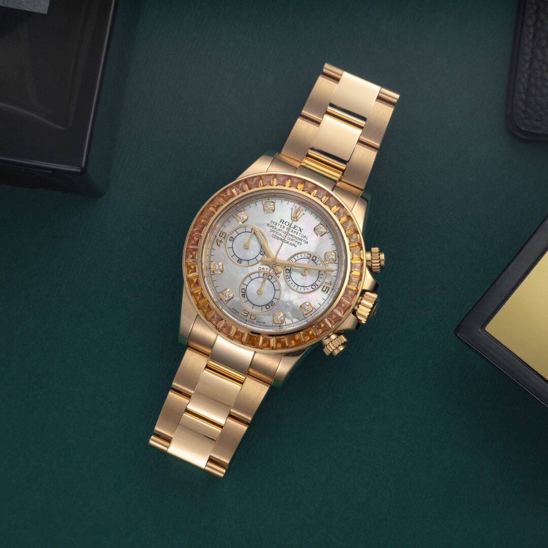 Rolex Daytona or jaune, cadran nacre, saphirs oranges