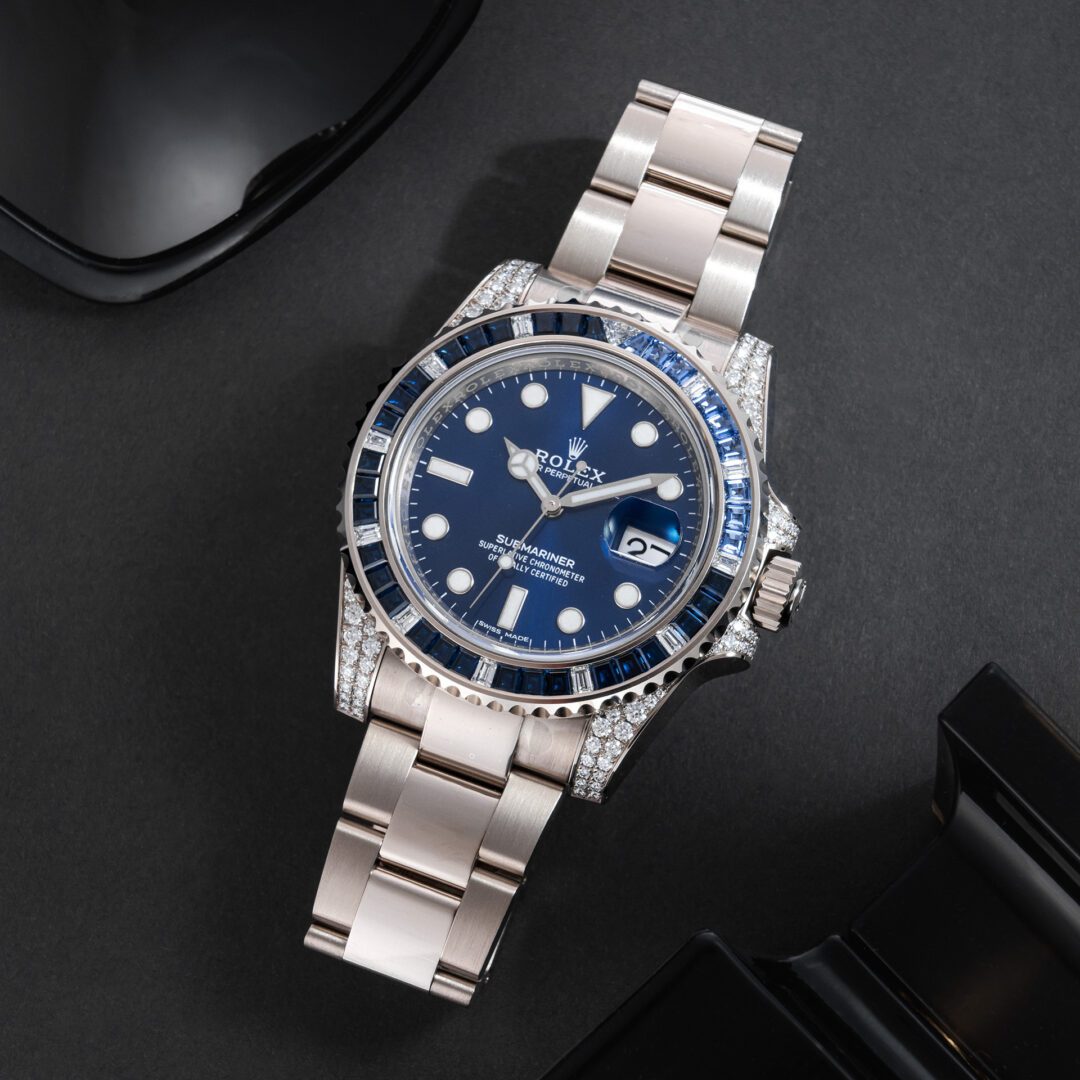 Rolex Submariner en or blanc, au cadran bleu nuit, sublimée par un sertissage de diamants et de saphirs bleus . Une plongeuse technique… mais surtout un bijou ( estimation : 150 000 €).