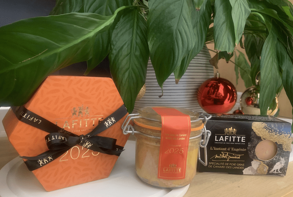 Depuis 1920, la Maison familiale Lafitte collabore avec des éleveurs locaux des Landes, sélectionnant des canards traditionnels dits « à souche lourde », nourris au maïs grain entier. Pour la quinzième année consécutive, et à l’occasion de ses 105 ans, la Maison Lafitte dévoile en édition limitée le premium de sa production 2025 : le Foie gras de canard entier des Landes Millésimé. Présenté dans un coffret chic et coloré, doré à l’or fin, il constitue un cadeau authentique et raffiné. Après un tri rigoureux, ce foie gras est préparé à l’ancienne selon la recette classique Lafitte, avec uniquement du sel, du poivre et des épices. Sans additif ni conservateur, il séduit par sa texture moelleuse et son goût rustique et sincère. Un délice à déguster pendant les fêtes ou à laisser vieillir et s’affiner dans son coffret. 180 g / 4 à 5 parts, 34,50 €.