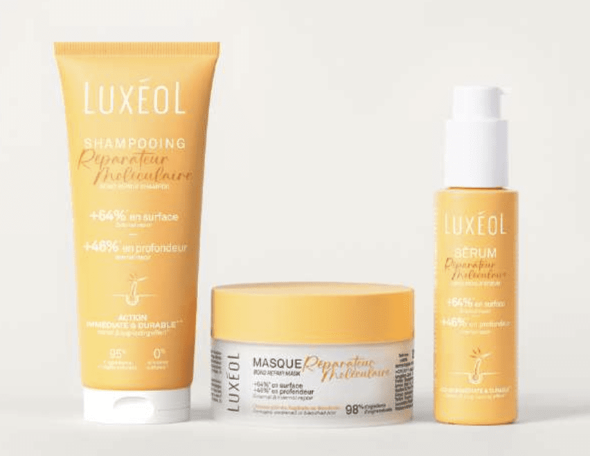 Pour répondre aux 70 % de femmes déclarant avoir les cheveux abîmés, Luxéol lance un protocole en 3 étapes (Shampooing, Masque, Sérum) sans silicones. Grâce à l’extrait de graines de chia et d’écorce de pin, la gamme promet une double réparation : 64 % en surface et 46 % en interne. On adore son parfum solaire (fleur de tiaré, prune, musc blanc). Shampooing 22,90 €, Masque 34,90 €, Sérum 39,90 €. Dispo en parapharmacies et sur luxeol.com
