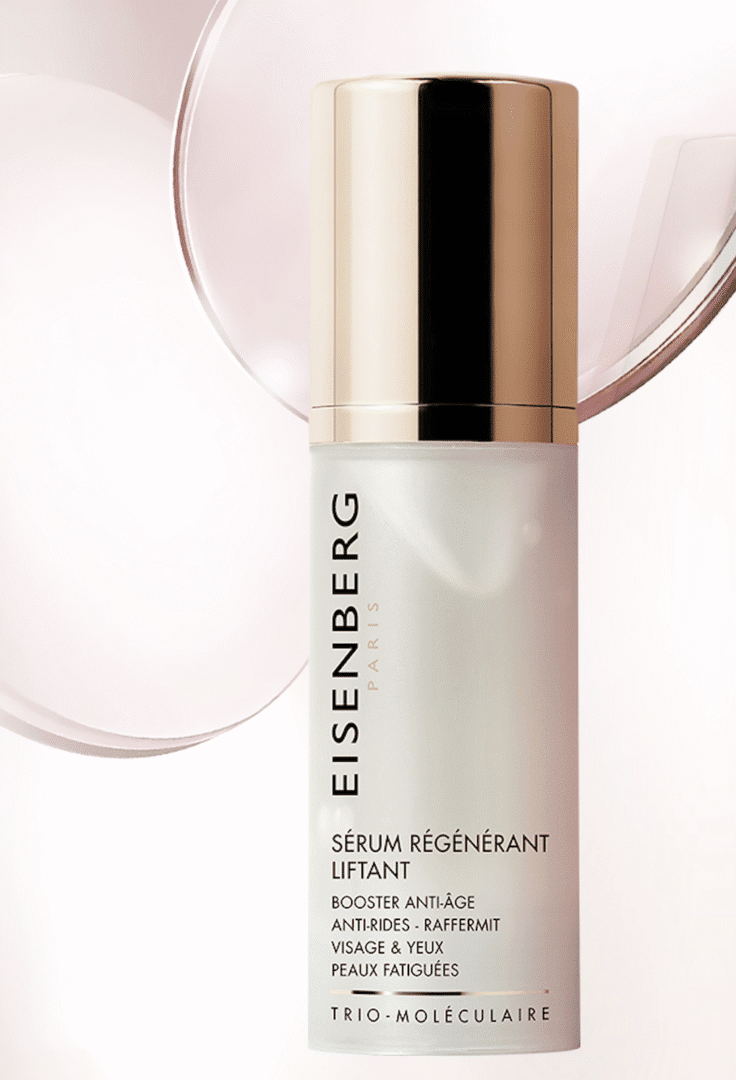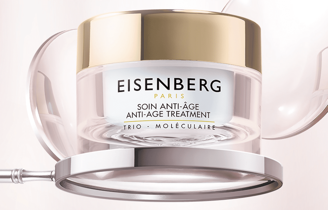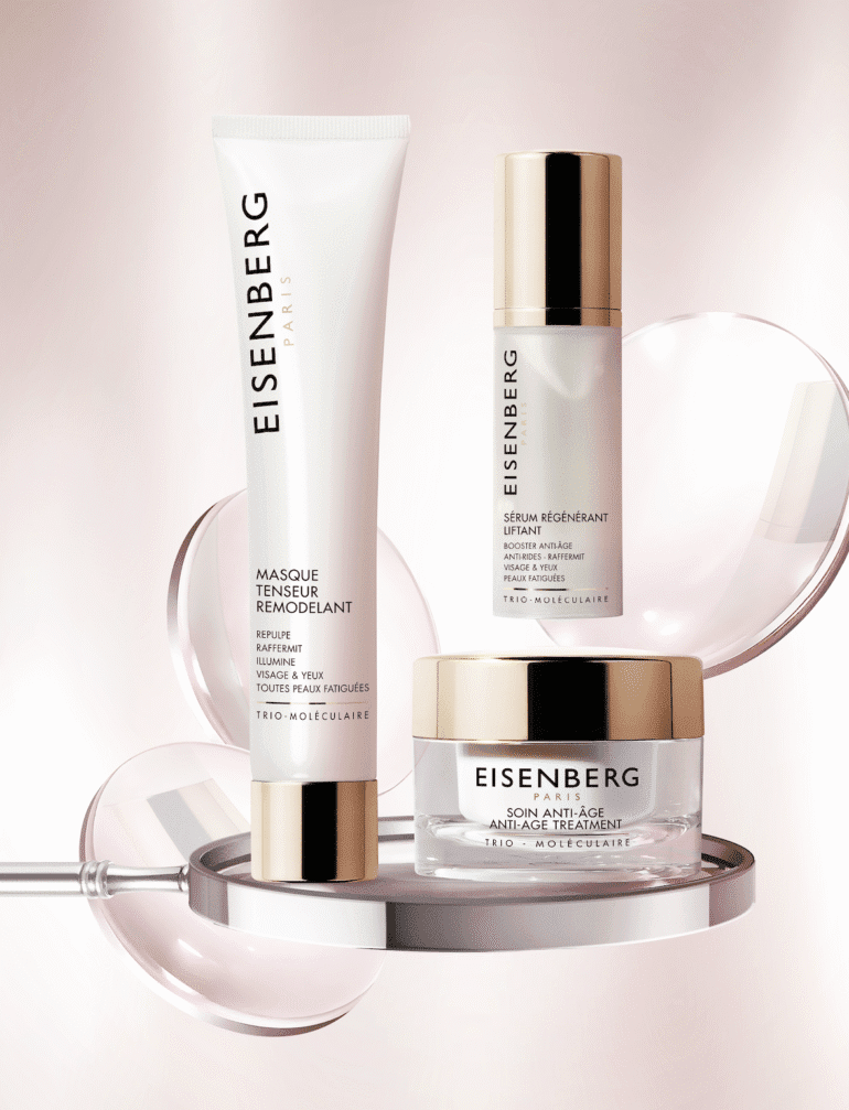 Au cœur de chaque soin Eisenberg se trouve une découverte scientifique majeure : la Formule Trio-Moléculaire®, brevetée dans le monde entier. Fruit de quinze ans de recherche, ce complexe d’origine naturelle agit en synergie pour aider la peau à retrouver ses fonctions fondamentales : Régénérer (Enzyme) : stimule le renouvellement cellulaire et la réparation des tissus; Énergiser (Cytokine) : relance la communication entre les cellules pour redonner tonus et fermeté; et Oxygéner (Biostimuline) : améliore la respiration cutanée et ravive l’éclat du teint.
