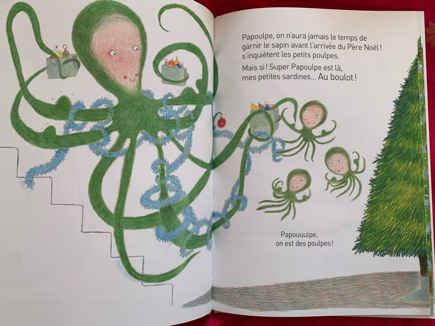Sous la mer aussi, Noël se prépare. Papoulpe a rapporté le sapin et, avec ses huit bras, se lance dans une décoration pleine d’énergie, sous le regard émerveillé de ses petits. L’histoire, simple et joyeuse, transmet la magie de Noël à hauteur d’enfant, à travers une famille aussi tendre qu’attachante, où l’on s’interroge même sur l’arrivée du Père Noël… en sous-marin.