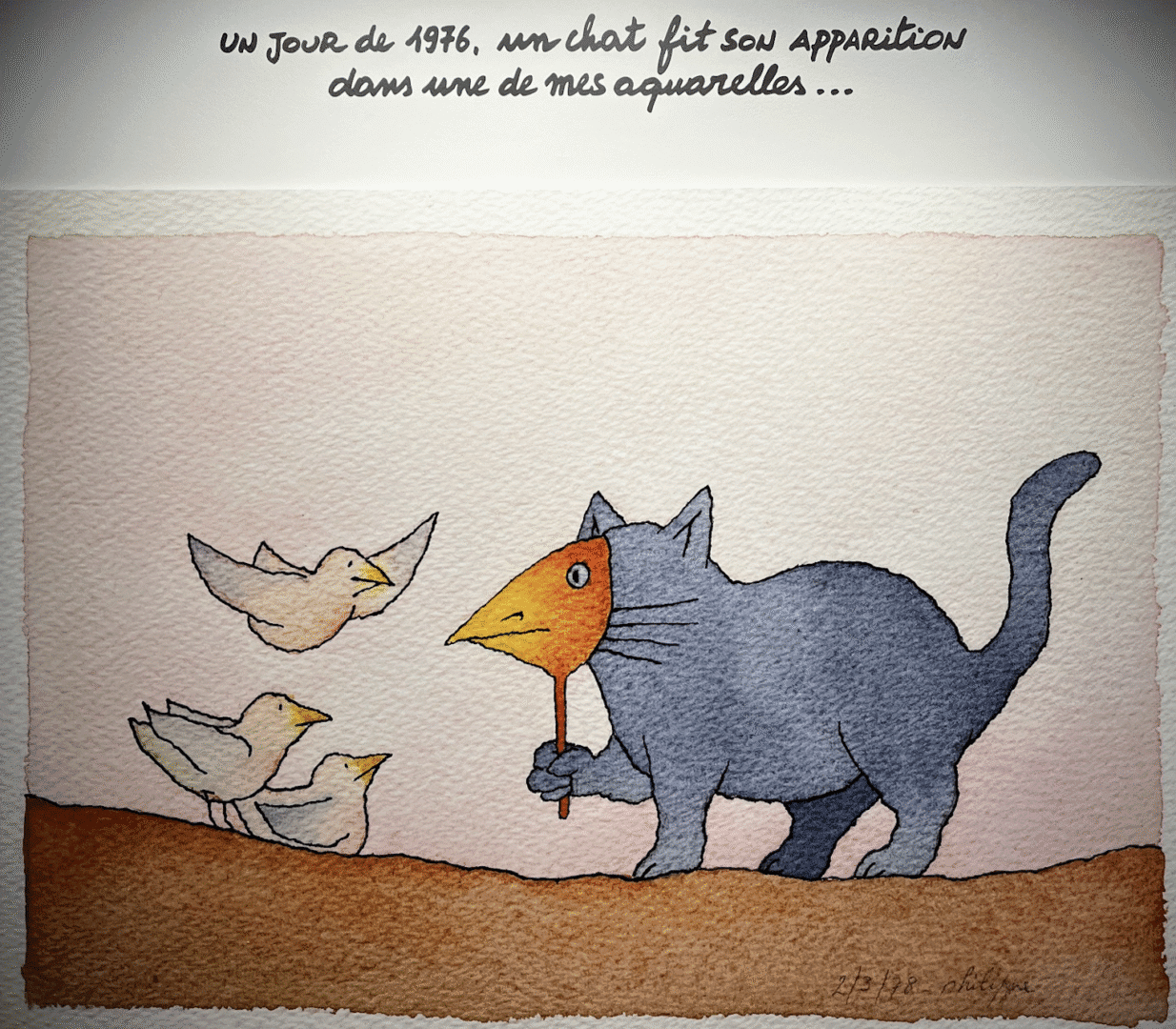 Les premières salles du parcours au premier étage, révèlent ces perles d’adolescence, puis les aquarelles d’un jeune artiste fasciné par Folon et Tomi Ungerer. Dans l’une d’elles, datée de 1976, un chat apparaît, sans lunettes ni costume. L’embryon d’une légende.