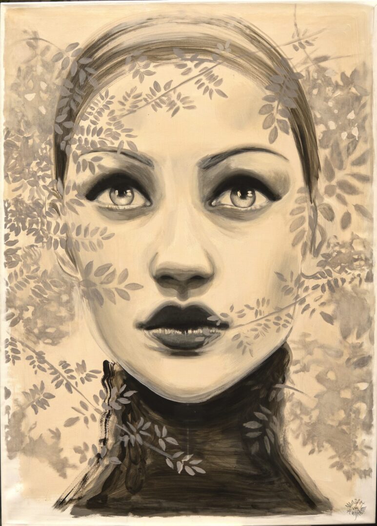 Sa technique est un voyage en soi : elle marie avec une finesse rare les aquarelles japonaises Gansaï, les encres de Chine et le fusain. Le résultat ? Des portraits vibrants, presque mouvants, où la force du regard capte immédiatement le visiteur.