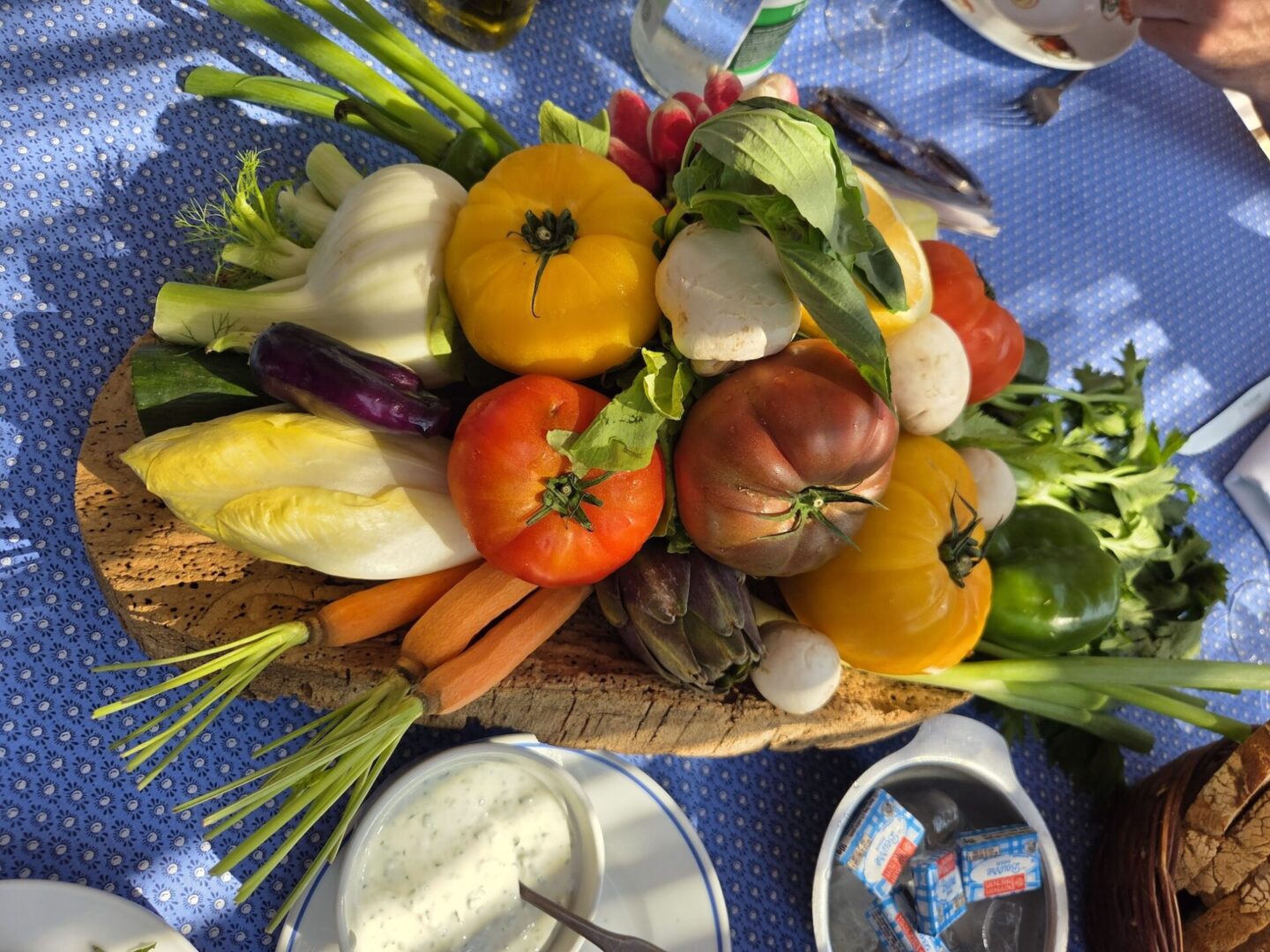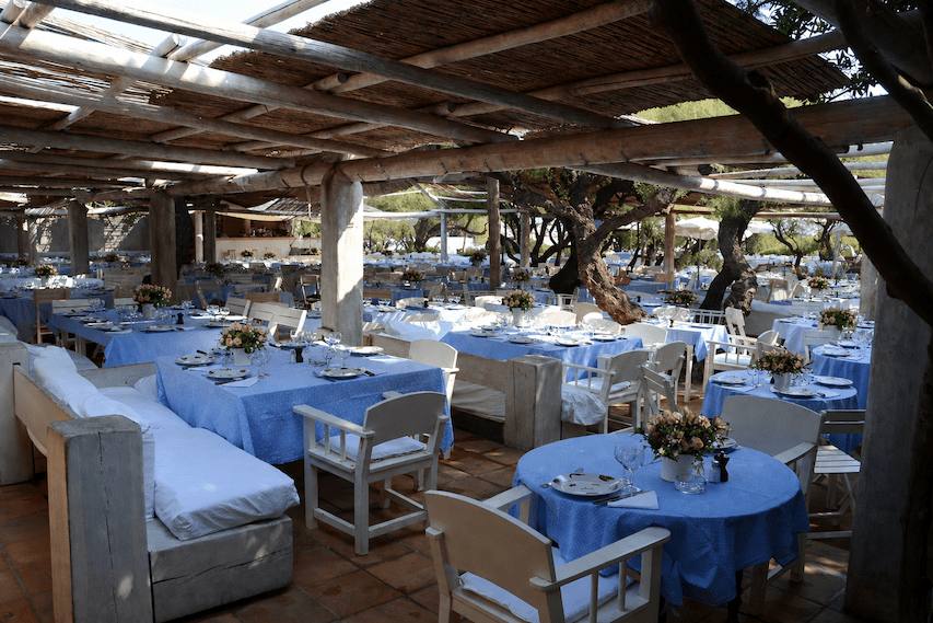 Une simplicité également dans les plats, les poissons sauvages et les viandes sont grillés. Les sauces toujours présentées à part. En effet, au Club, le grand luxe est dans la qualité exigeante de chaque produit : les fruits, les légumes et les céréales anciennes sont cultivés en agriculture biologiques dans les potagers du Club : la ferme des Bouis, le Domaine de la Mole et le domaine Piegros, de même que le vin et l’huile d’olive servis à table. Les viandes et les poulets proviennent de producteurs soigneusement identifiés, les poissons, en partie de la pêche locale. Et pour conserver une atmosphère conviviale et accessible, une entrée et un plat du jour sont présents au menu, ce qu’adorent les habitués qui réservent longtemps à l’avance le vendredi pour l’aïoli, ou le dimanche pour la paëlla. Et parmi les délicieux desserts comme le gâteau au chocolat fondant ou la généreuse tarte aux fruits rouges, bien entendu, la tarte tropézienne de la boulangerie Les deux frères à Saint-Tropez est au menu.