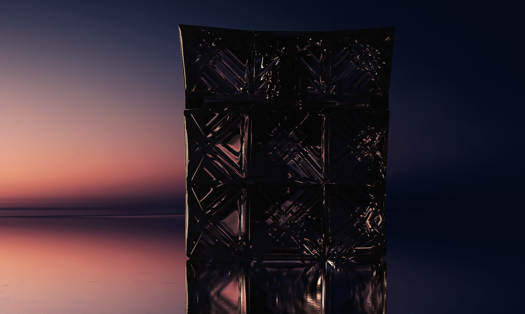 Si l’odeur séduit, l’objet, lui, fascine. Imaginé par le Miyake Design Studi, il joue sur des facettes triangulaires précises. Ce n’est plus un contenant, c’est un prisme. À chaque mouvement, le verre attrape les rayons environnants pour les diffracter, créant un jeu de kaléidoscope permanent. Le choix du rose solaire pour le jus apporte une note de tendresse à cette structure architecturale forte. Même l’étui, parsemé de triangles argentés sur fond blanc, évoque la lumière qui jaillit.