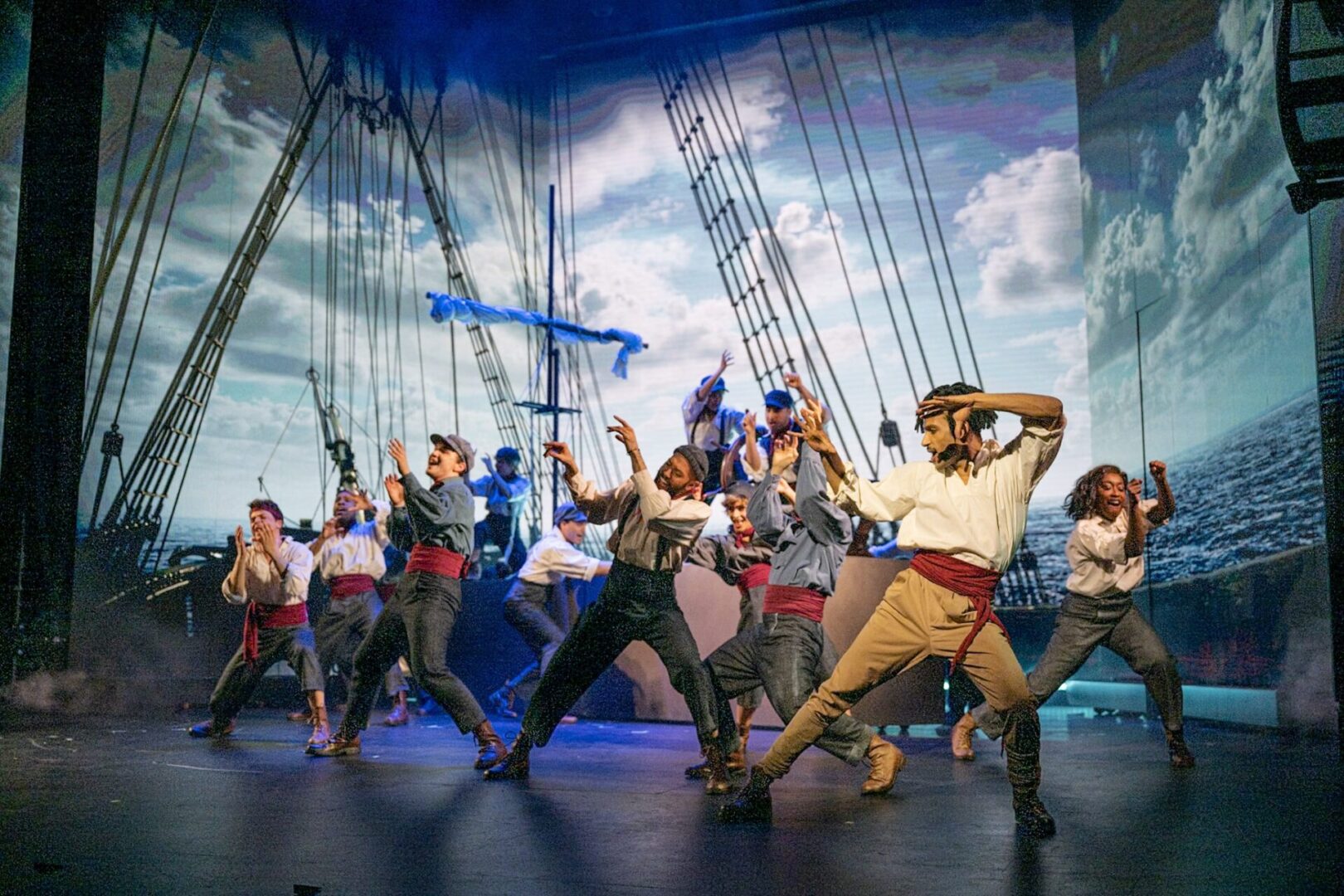 L’un des paris les plus audacieux de cette création réside dans sa signature sonore. Confiée à Benoît Poher, leader du groupe Kyo, et à son complice Franklin Ferrand, la musique insuffle une modernité vibrante au texte de Dumas. Les chansons, aux accents pop-rock, soutiennent l’élan dramatique et donnent aux scènes collectives un souffle épique, à commencer par l’ouverture maritime vibrante interprétée par les matelots. Le pari est audacieux : faire dialoguer un roman du XIXe siècle avec une écriture musicale actuelle. Le résultat séduit par son efficacité et son intensité.