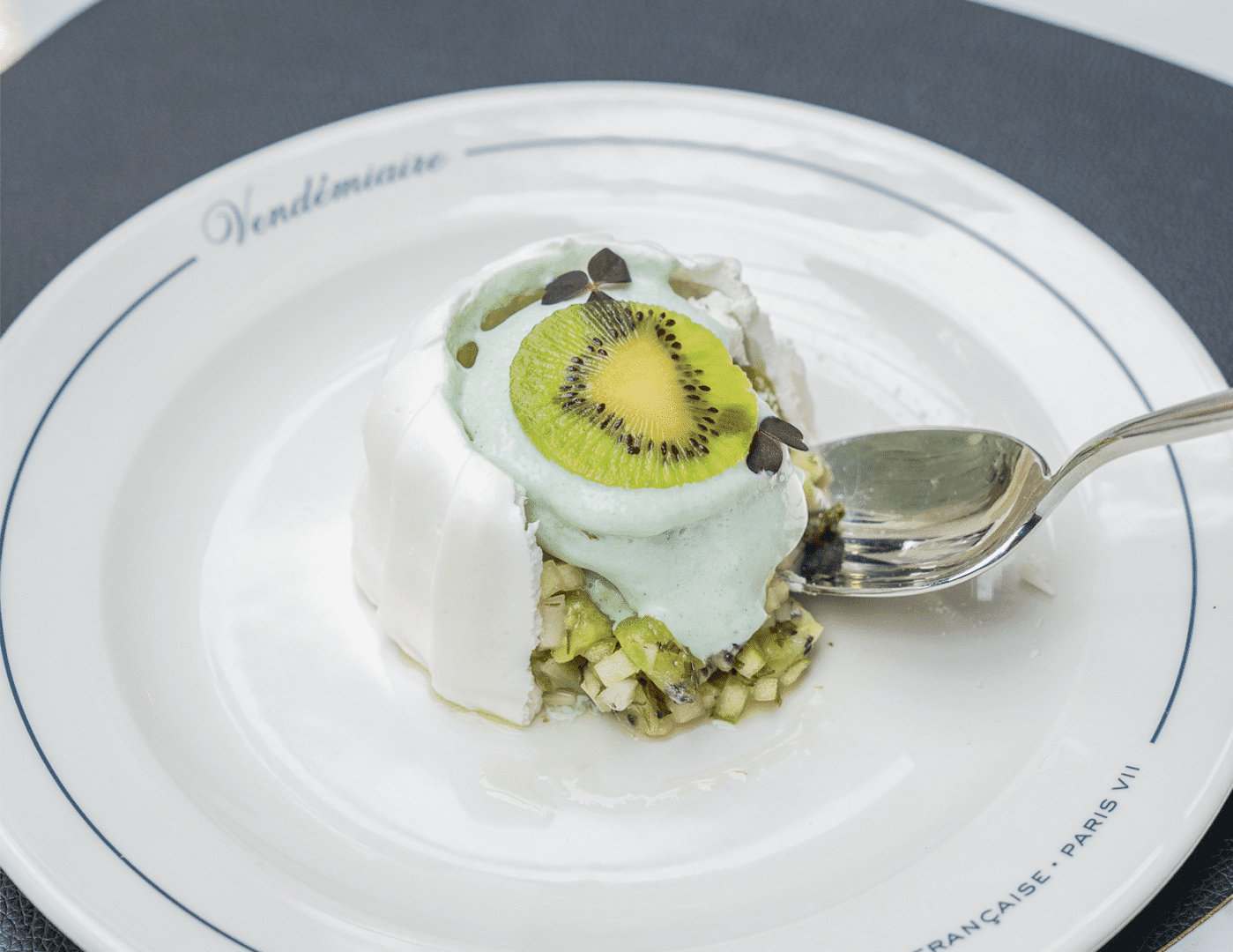 Les douceurs insurgées : Pour finir en beauté, la cheffe pâtissière, Asia Goncalves, venue de chez Lenôtre, joue la carte de l’étonnement : pavlova kiwi et chartreuse verte, baba au rhum miel et safran, crème brûlée, twistée à la fève tonka …