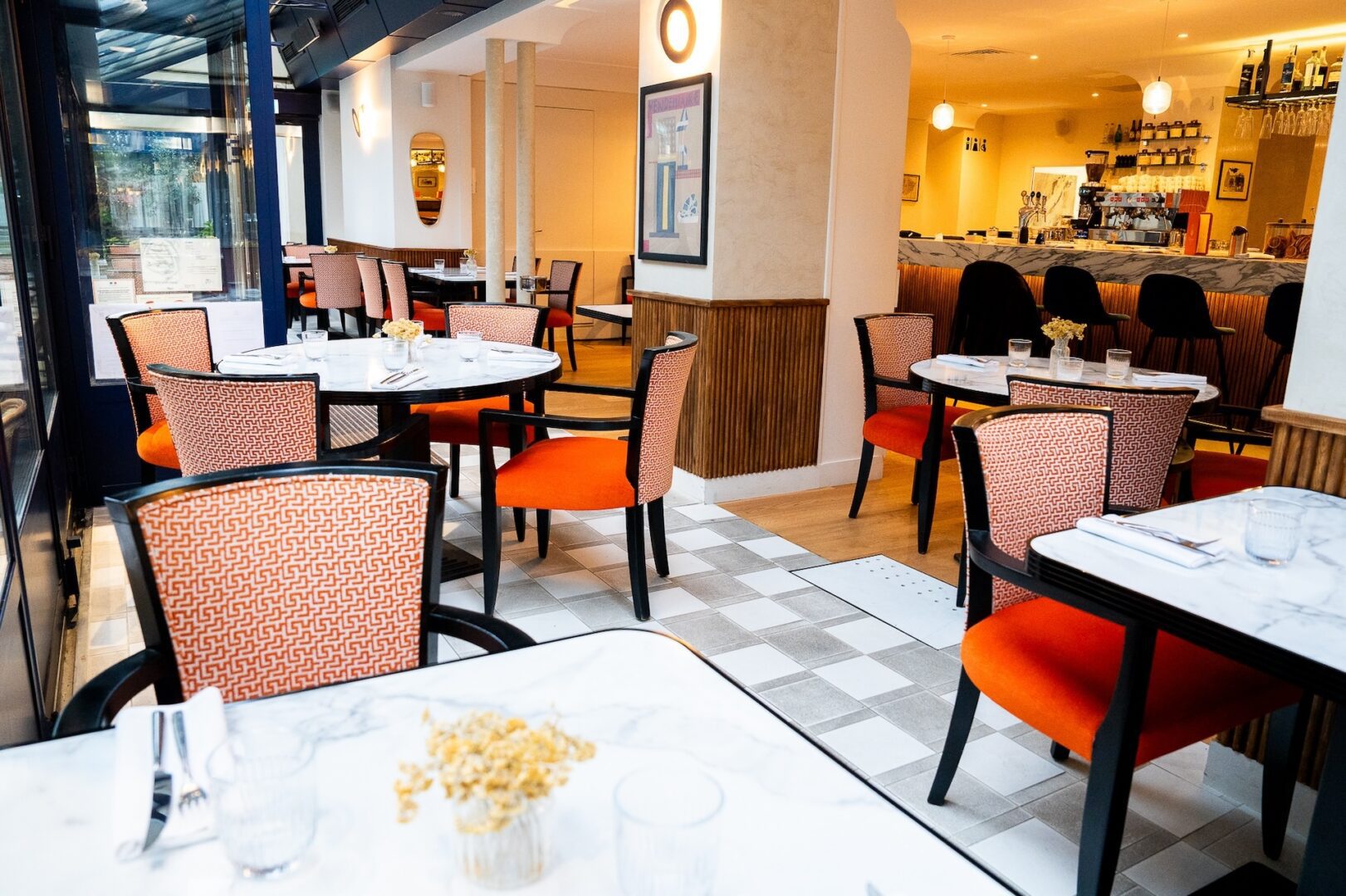 Rien n’a changé du charme magnétique opéré par l’agence Black Balloon. On retrouve avec bonheur ce décor rétro-contemporain où le bleu profond et l’orange vif se répondent. L’iconique comptoir en marbre blanc reste le cœur battant du lieu, favorisant les échanges, idéal pour y déjeuner – en solo – ou prendre un cocktail en fin de soirée.