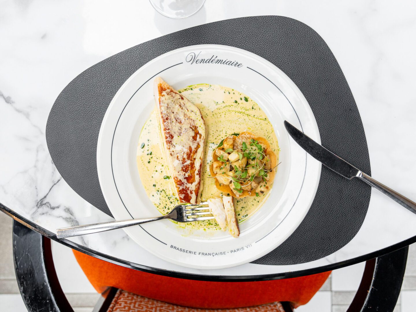 Les entrées manifestes : L’œuf mayo Vendémiaire se pare de livèche et d’esturgeon fumé, tandis que le pâté en croûte de gibier rappelle les plus belles heures de la gastronomie française. Sans oublier l’incontournable soupe à l’oignon et les huîtres !