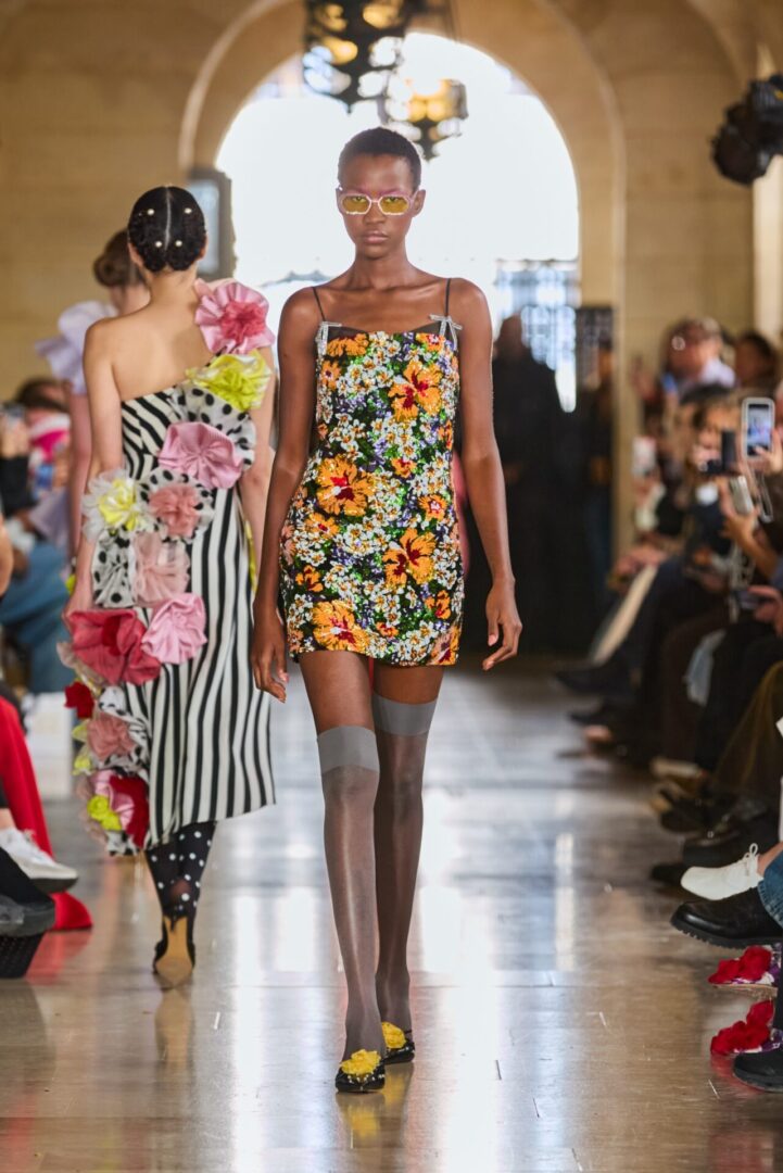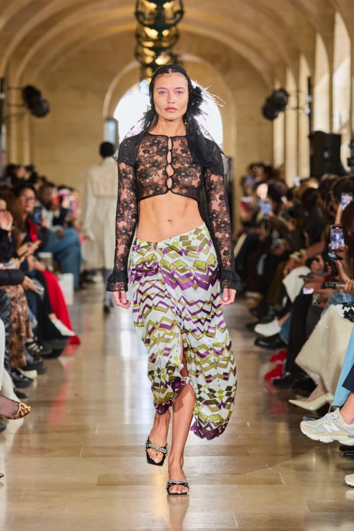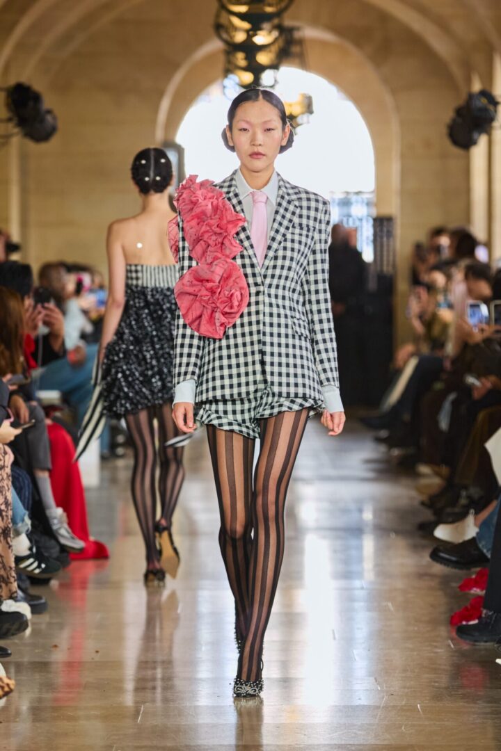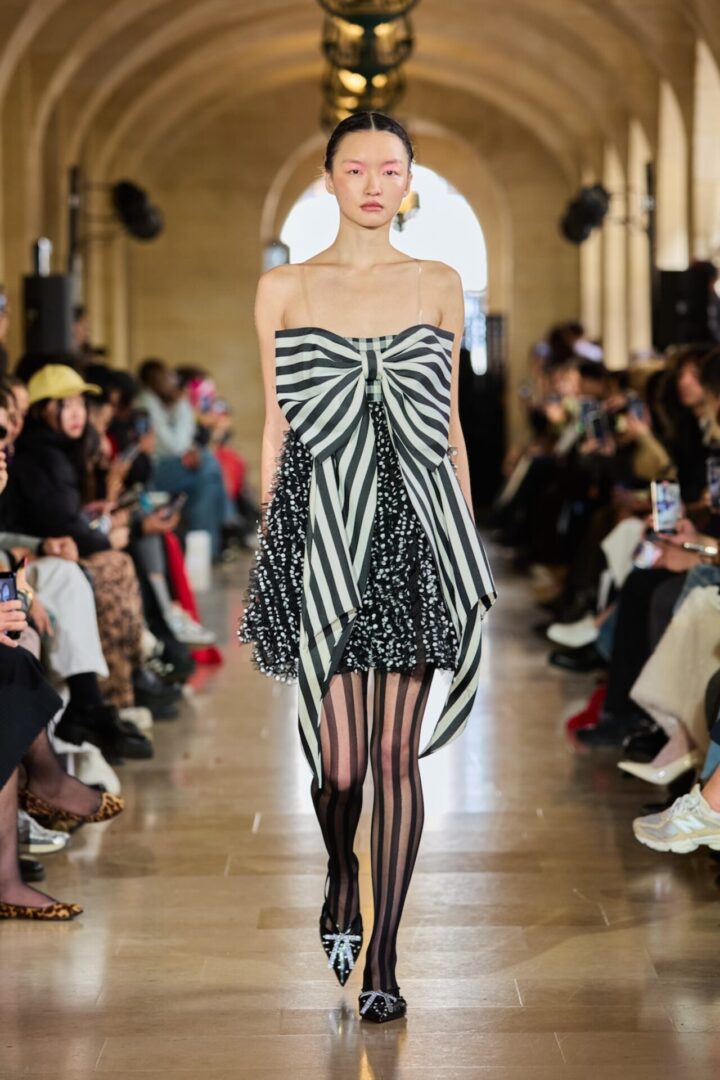 Tout au long de la collection, les nœuds se déploient, les fleurs s’épanouissent, et les volants ondulent avec une grâce dramatique. Les jeux de transparence noir et blanc tissent une tension délicate entre romantisme et puissance.