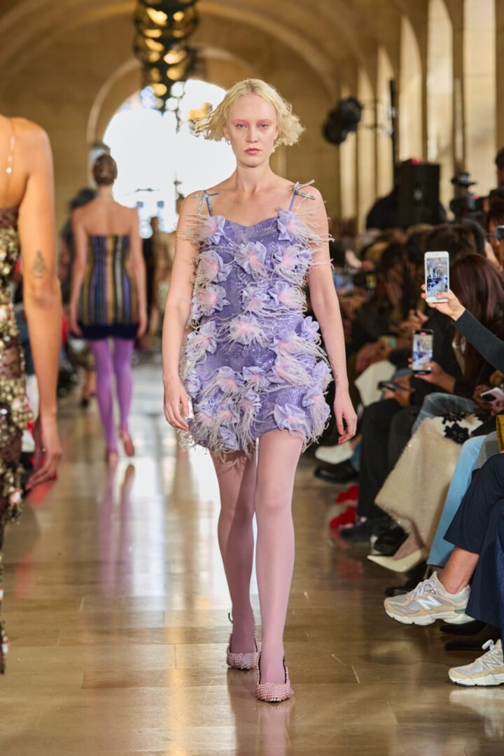Le défilé s’ouvre sur un voyage onirique, une dérive qui transporte la créatrice du tumulte de la ville moderne vers la rêverie lumineuse de la dynastie Tang. Les silhouettes se déploient dans un ballet de teintes soyeuses : rouges éclatants, ors liquides, et une glycine tendre inspirée des dessins d’enfance de Qiu.