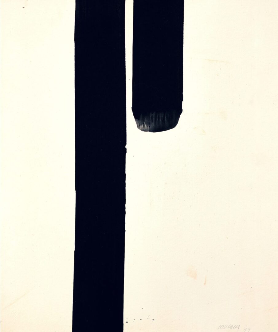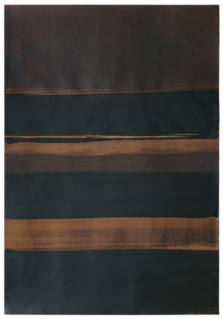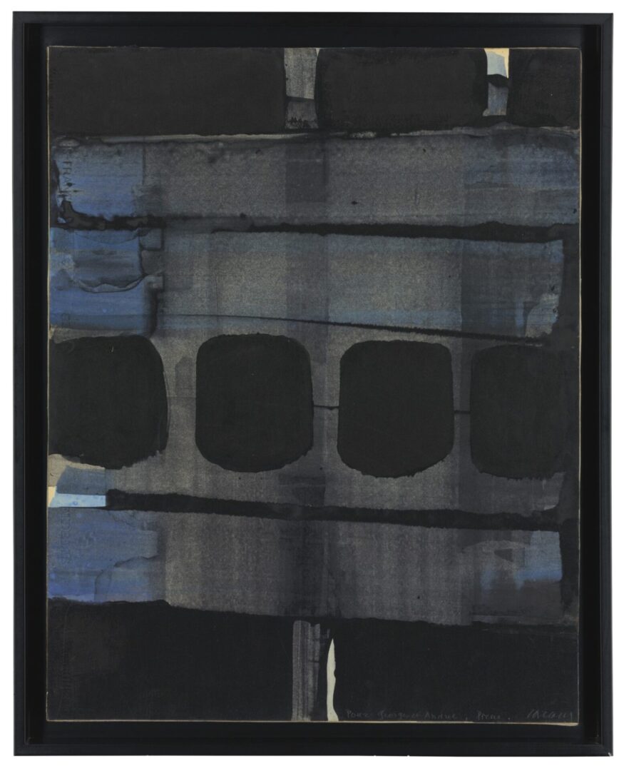 Soulages a toujours refusé de hiérarchiser ses supports. Mais le papier est bien plus qu’un « laboratoire » pour la toile : il est un champ autonome, parfois même plus radical. Avec le brou de noix, qu’il adopte dès 1946, Soulages invente un langage plastique direct, sans repentir. Transparence, opacité, lumière et matière se heurtent et dialoguent sur un format souvent restreint mais d’une intensité rare.