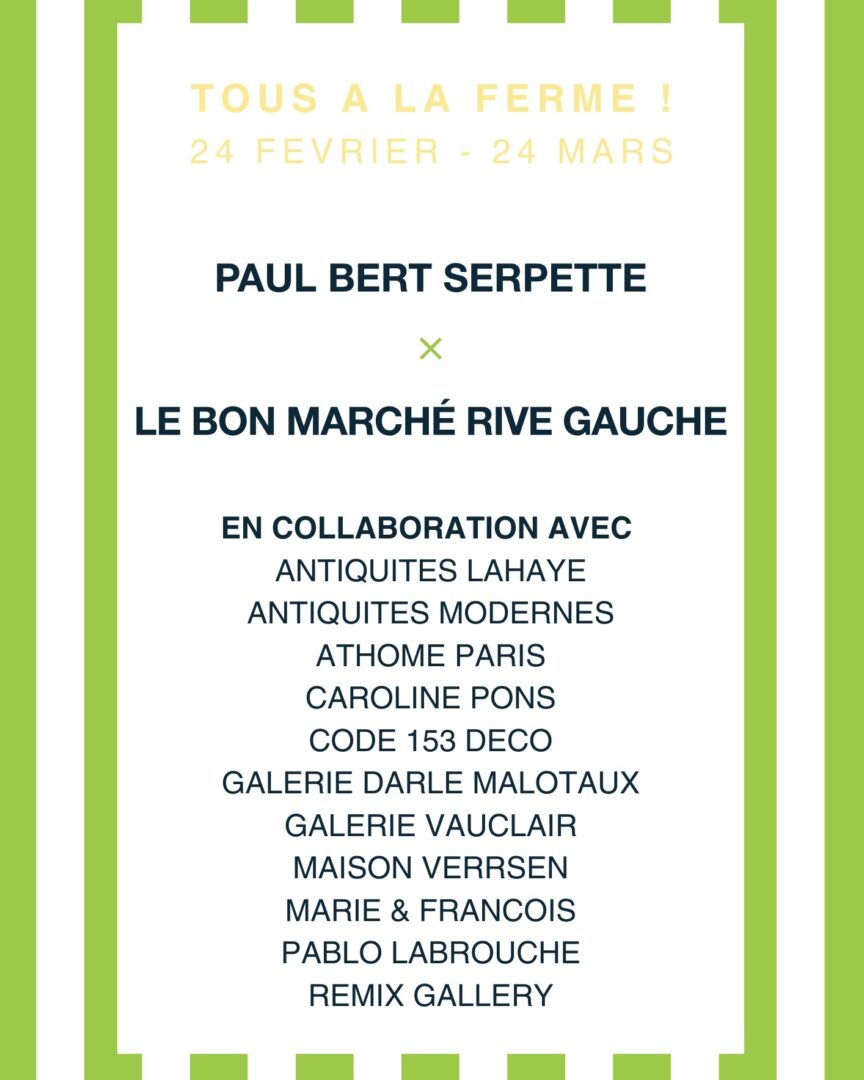 Exposition “Tous à la ferme !”  avec Paul Bert Serpette, au  Bon Marché Rive Gauche, Restaurant « La Table » au premier étage de la Grande Epicerie de Paris , 24 rue de Sèvres, Paris 7e. Entrée libre aux horaires du magasin. Jusqu’au 24  mars 2026.