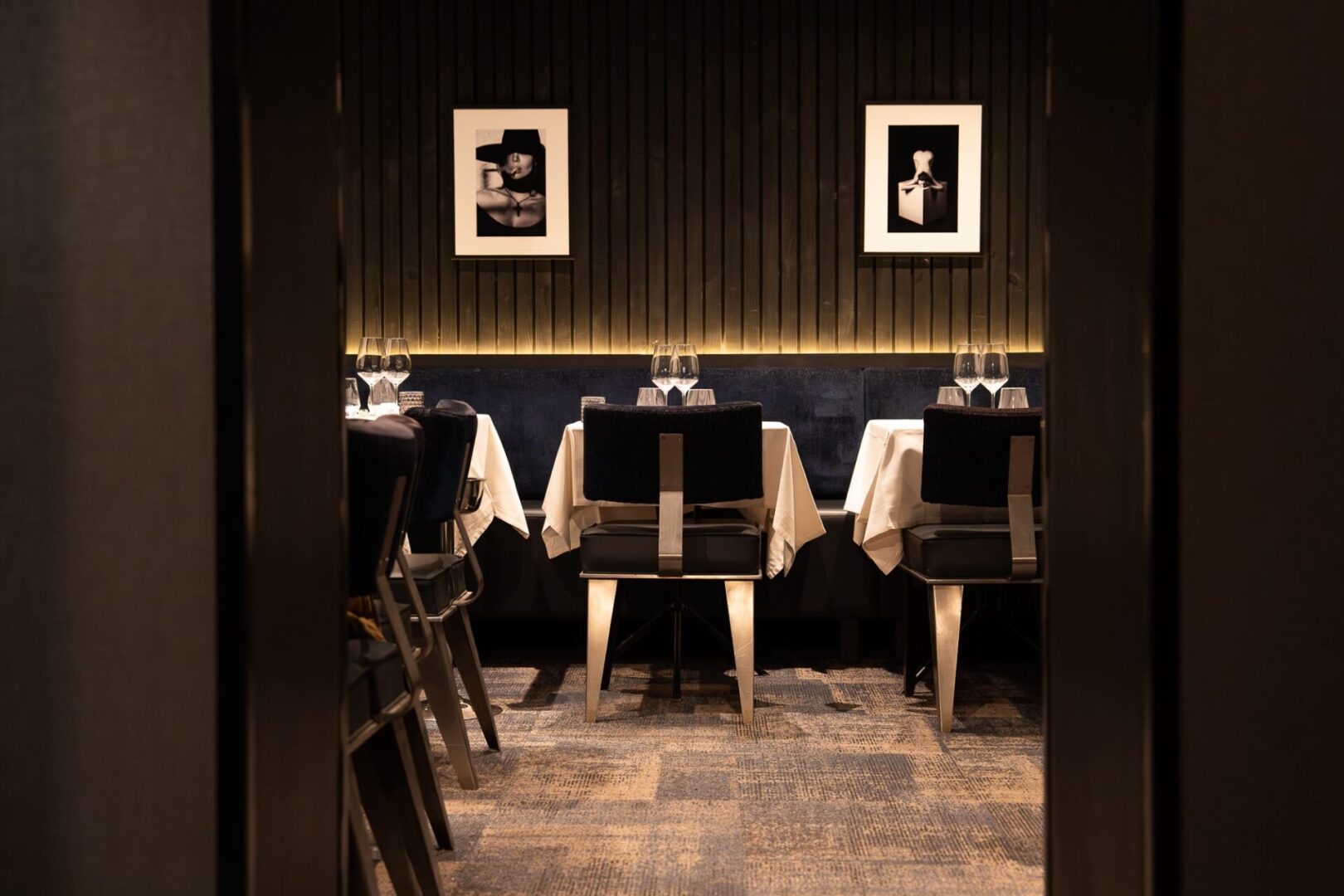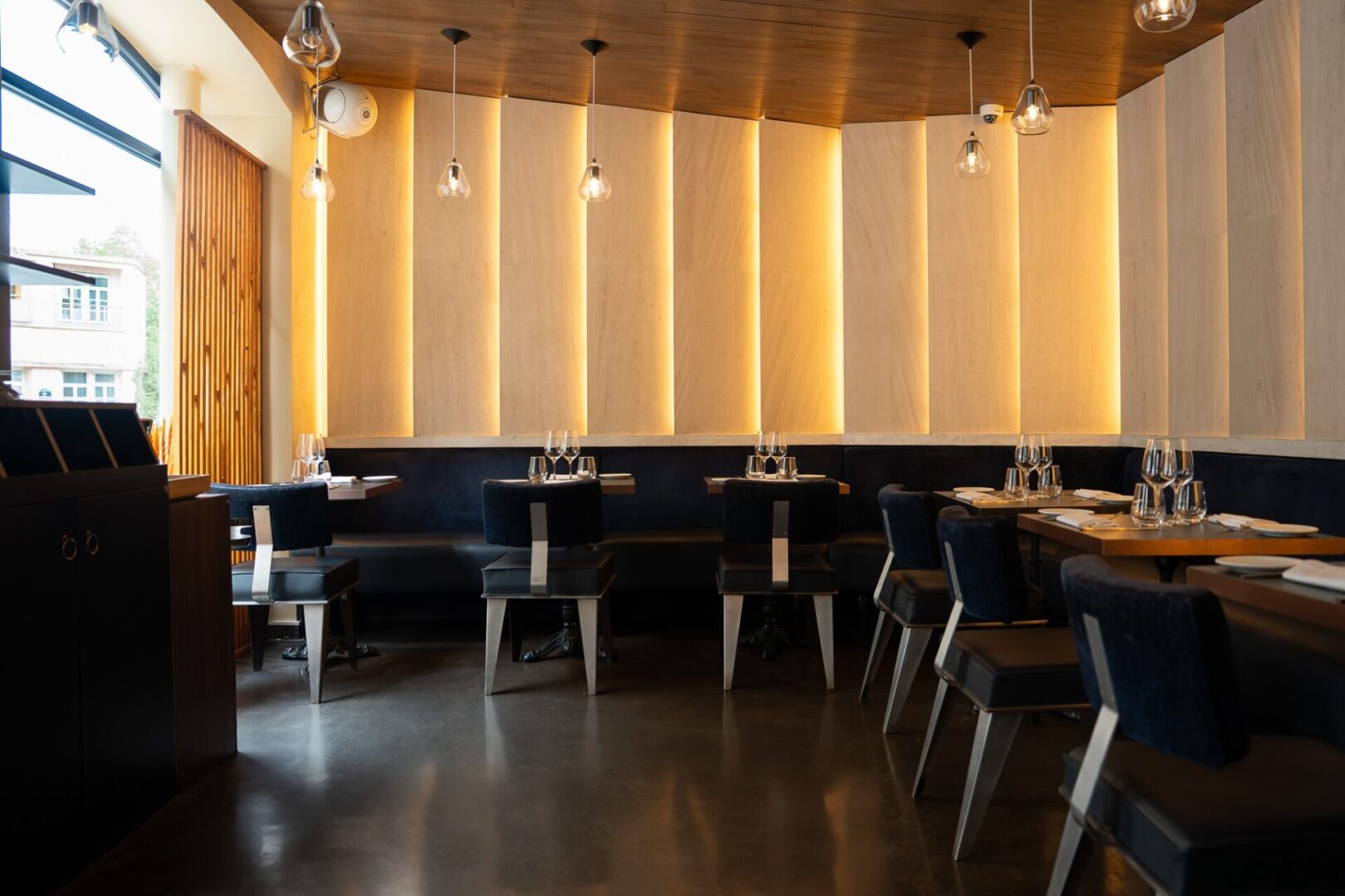 En lieu et place de l’ancien restaurant TO, Vertueux séduit par son décor chic et moderne. Le parcours débute dans une première salle à la sobriété japonisante et raffinée; se poursuit dans un second espace plus cosy ( photo en une ), voire romantique, habillé de tasseaux de bois graphiques. Enfin, pour les initiés, le sous-sol cache un salon confidentiel avec vue plongeante sur le ballet de la brigade. En salle, le service est attentif, fluide et parfaitement orchestré.
