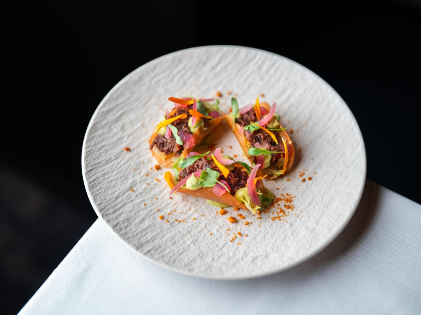 La magie de Raul Meza réside dans sa capacité à hisser les produits de sa terre natale au rang de mets gastronomiques. Le tamarillo (tomate-arbre) apporte sa vivacité amère, le maïs se décline en une infinité de textures, tandis que la banane plantain s’invite avec malice sous forme de gnocchis ou de chips croquantes. Le voyage débute par exemple par des Tacos Mestizos à l’effilochée de bœuf épicé, un ceviche de poisson relevé de coriandre et de citron vert ou un Tiradito de thon, ultra frais au tamarillo. La suite est une démonstration de maîtrise : Lieu jaune à la plancha et miso, Homard bleu à l’Ajillo lové dans un risotto soyeux, Filet de bœuf d’Argentine, d’une tendreté absolue, escorté d’oignons rôtis et d’un pressé de patate douce au jus de thym.